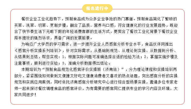 >>持續(xù)招生〡12月SEPA預(yù)制食品規(guī)范化感官評價實(shí)操班,我們在濟(jì)南等您!