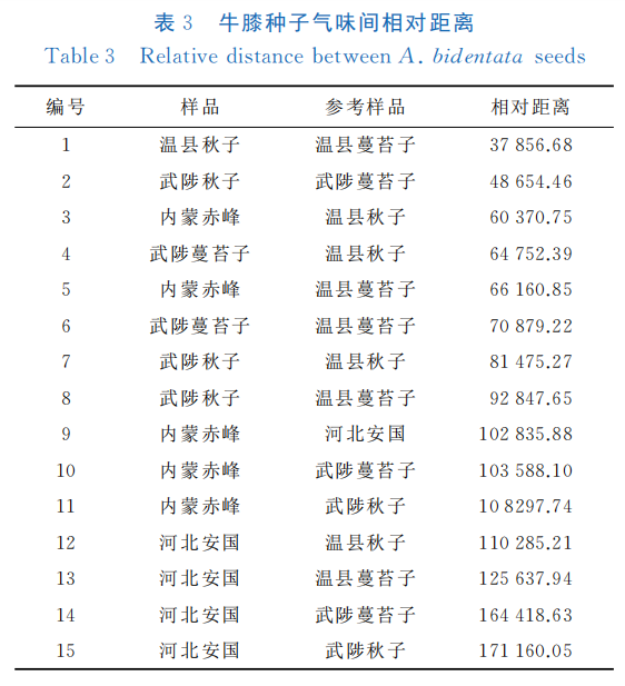 表3為樣品氣味兩兩間相對距離表。樣品間的相對距離越近,則整體氣味越接近,反之亦然。由表3可知,溫縣秋子與溫 縣蔓苔子的相對距離最近(37859.68),其次是武陟秋子與武陟蔓苔子(48654.46),秋子與蔓苔子是牛膝的2種不同繁殖類型的種子,其整體氣味較相近,符合實際生產規律。而河北安國與武陟秋子相對距離最遠(171160.05),即其氣味與武陟秋子差異最大。