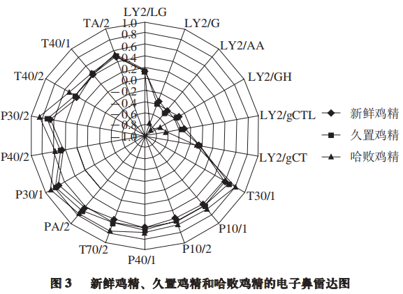 分別將新鮮雞精、久置雞精和哈敗雞精的電子鼻數據作雷達圖,對比結果如圖3所示。3 種雞精樣品被明顯地區(qū)分開來。哈敗雞精的風味輪廓明顯與新鮮雞精、久置雞精不同,傳感器T40/2、P30/2、P40/2、P30/1、PA/2、T70/2、P40/1、P10/2、P10/1、T30/1的響應值明顯大于新鮮雞精、久置雞精;傳感器LY2/gCTL、LY2/GH、LY2/AA、LY2/G的響應值由于是負值,哈敗雞精的響應信號則明顯低于新鮮雞精、久置雞精,說明哈敗雞精的響應值信號與新鮮雞精、久置雞精有較大差異,電子鼻分析得到新鮮雞精和久置雞精的風味輪廓更為接近,并與哈敗雞精有較大不同。