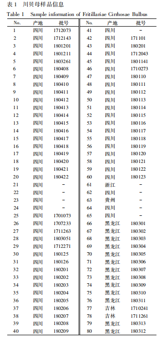 外觀性狀不滿足的樣本有23,24,43~46,61~80 號; 顯微結(jié)果顯示樣本 71,74,78 號不含螺紋導(dǎo)管,其余均滿足藥典要求; 薄層結(jié)果顯示樣本 23,24 號中不含貝母素乙,61~80 號與平貝母對照藥材相對應(yīng)的位置顯相同顏色的斑點; 80 個樣本貝母素甲、西貝母堿、貝母素乙 3 種生物堿總量均為 0~0. 05%,判別結(jié)果見表 2。