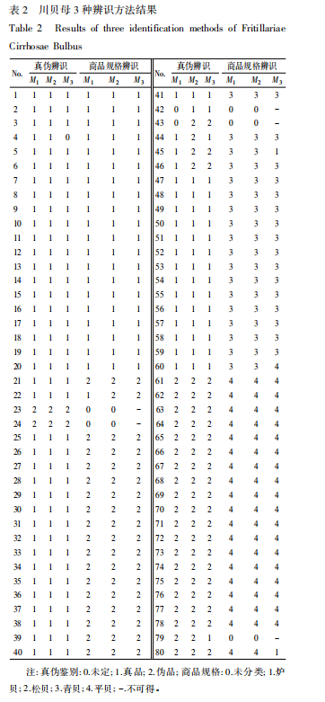 聘請 8 位在中藥鑒定研究領(lǐng)域擁有豐富經(jīng)驗的專家( 具有 15 年以上工作經(jīng)驗且一直在醫(yī)藥行業(yè)從事中藥飲片檢驗、鑒定工作) ,參照 2015 年版《中國藥典》一部質(zhì)量標準外觀性狀規(guī)定,將編號后的樣品隨機放置,由專家依據(jù)顏色、形狀、氣味、質(zhì)地、口感等差異結(jié)合既往經(jīng)驗進行鑒定,對川貝母的真?zhèn)渭吧唐芬?guī)格做出鑒定。最后,以評價專家人數(shù)是否≥3 /4 比例原則確定每個樣本的真?zhèn)渭吧唐芬?guī)格。