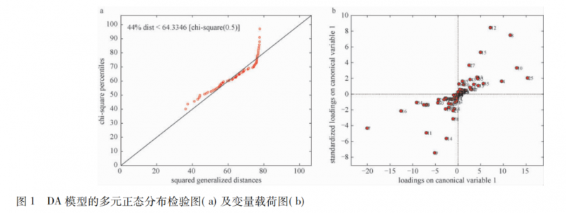 DA 辨識模型及交互驗證 80 個樣本的測試結(jié)果多元正態(tài)分布檢驗圖見圖 1,橫坐標為平方廣義距離,縱坐標為卡方上側(cè)分位數(shù)對應(yīng)的檢驗值。樣本分布圖形略呈線性; 約 44%的距離小于卡方分布分位數(shù)表 0. 5 對應(yīng)的檢驗值,說明檢驗值在卡方分布分位數(shù)表 0. 5 對應(yīng)的檢驗值的下側(cè)分布略微集中。