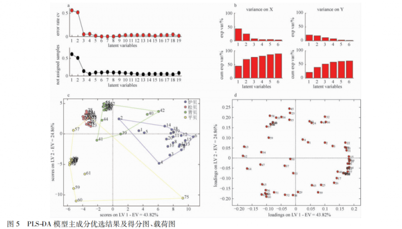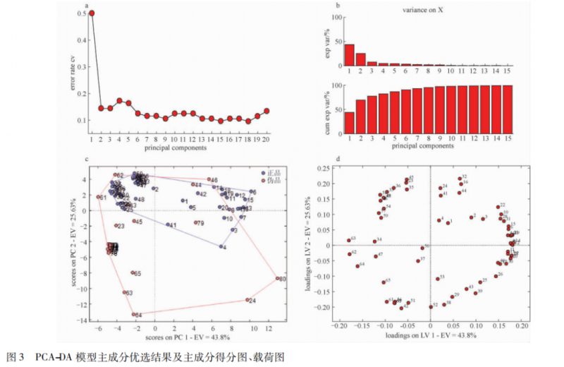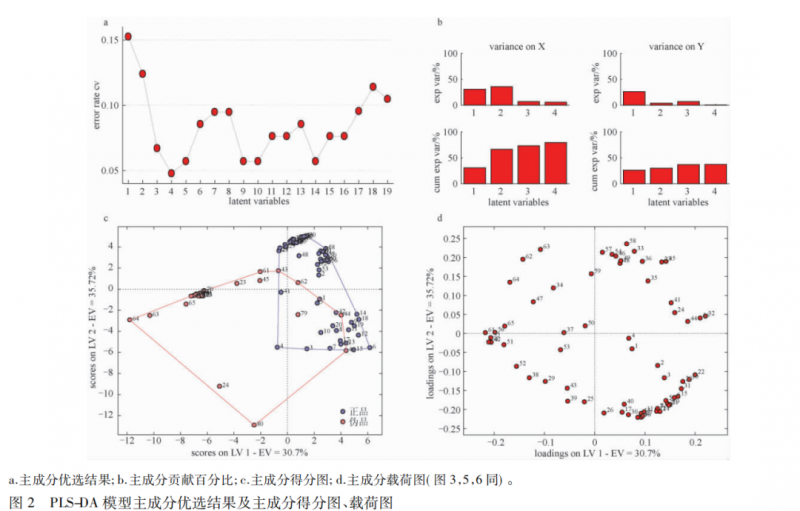 PLS-DA 辨識結(jié)果顯示,54 個正品中有 1 個被錯判為偽品,26 個偽品有 2 個被錯判為正品,模型整體正判率為 96. 2%。