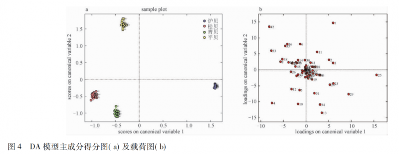 結(jié)果顯示,20 個爐貝樣本中有 2 個未被分類; 18 個松貝樣本中有 1 個未被分類; 18 個青貝樣本中有 1 個未被分類; 19 個平貝樣本中有2 個未被分類; 其余分類均正確,模型整體正判率為 90. 7%。