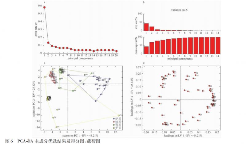 變量選擇14 個,識 別 模 式 選 擇 線 性; 模 型 最 優(yōu) 正 判 率 為97. 3%。前 3 個主成分之和達 75%以上,可解釋原變量大部分信息,見圖 6。