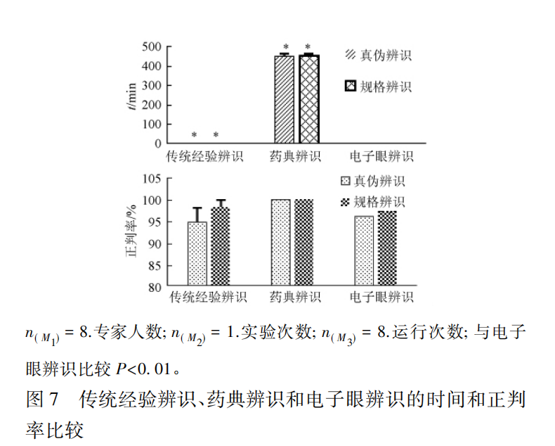 通過比較,電子眼辨識與傳統(tǒng)經(jīng)驗辨識正判率無顯著性差異; 電子眼辨識不如傳統(tǒng)經(jīng)驗辨識快( P<0. 01) ,但較藥典檢測快( P<0. 01) ,見圖 7。