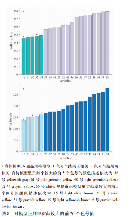 在只考慮變量信息本身、不考慮分類結(jié)果模型的情況下,65 個變量所攜帶變異信息( Wilkslamda) 的柱狀圖見圖 8,Wilkslamda 越小則表示變量攜帶變異信息越多。真?zhèn)伪孀R中 65 個變量在潛變量上的載荷圖,見圖 2,50 號變量在原點附近,說明該特征屬性的波動對于樣本之間的區(qū)別貢獻不大,其余64 個變量整體較為分散,說明這 64 個變量均攜帶有顯著的變異信息。商品規(guī)格辨識中 65 個變量在潛變量上的載荷圖見圖 6。