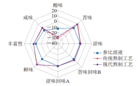 傳統工藝熬制和現代工藝熬制的“佛跳墻”滋味上的差異可以通過電子舌區分,二者之間的差異主要表現在苦味和澀味上。