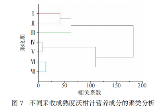 采用系統聚類分析方法對不同采收成熟度沃柑汁的營養成分進行R型聚類,聚類方法為組間聯接法,聚類區間為平方歐式距離,由圖7結果可知,采收期Ⅰ、Ⅱ沃柑汁歸為一類,采收期Ⅲ的沃柑汁歸為一類,采收期Ⅳ、Ⅴ沃柑汁歸為一類,采收期Ⅵ、Ⅶ沃柑汁歸為一類。綜合維生素C、總酚、氨基酸、類胡蘿卜素、檸檬苦素含量變化考慮,Ⅳ、Ⅴ采收期的沃柑營養成分含量均較高。