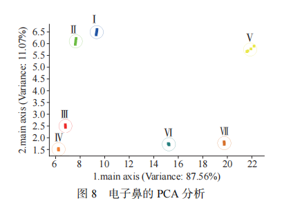隨著果實成熟度的變化,不同采收期沃柑汁的電子鼻PCA分析結果如圖8所示。由圖可以看出,PCA分析圖橫坐標代表第一主成分(PC1),其貢獻率為87.56%,縱坐標代表第二主成分(PC2),其貢獻率為11.07%,前兩主成分的貢獻率累計為98.63%,能夠反映樣品的主要特征信息。同時PC1對區分不同采收期的沃柑汁起主要作用,基于電子鼻的分析結果發現:不同采收期的沃柑汁可以很好區分,完全沒有重疊,說明隨著成熟度的變化,沃柑風味不同,另外采收期Ⅰ與Ⅱ、采收期Ⅲ與Ⅳ的距離較近,說明Ⅰ與Ⅱ、Ⅲ與Ⅳ采收期的沃柑果汁風味較接近。由此可見,不同采收成熟度的沃柑汁揮發性物質不同,電子鼻可以準確識別出不同成熟度沃柑汁的特征氣味,并進行準確區分