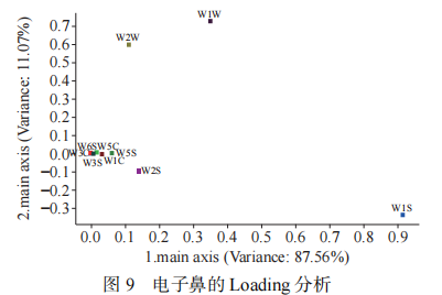 利用Loading分析可以區分當前模式下傳感器的相對重要性,若傳感器的響應值越偏離零,則該傳感器在識別中作用較強,即為識別傳感器,反之,如果響應值接近零,則該傳感器識別力可以忽略。由圖9電子鼻的Loading分析可以看出,PC1和PC2傳感器的貢獻率分別為87.56%、11.07%,總貢獻率為98.63%,在主成分1(PC1)貢獻率方面,傳感器W1S的貢獻率最大,其次是傳感器W1W;而在主成分2(PC2)貢獻率方面,傳感器W1W的貢獻率最大,其次是傳感器W2W。說明第一主成分主要反映的是對甲基類,其次是無機硫化物,第二主成分主要反映的是無機硫化合物,其次是芳香成分、有機硫化合物。