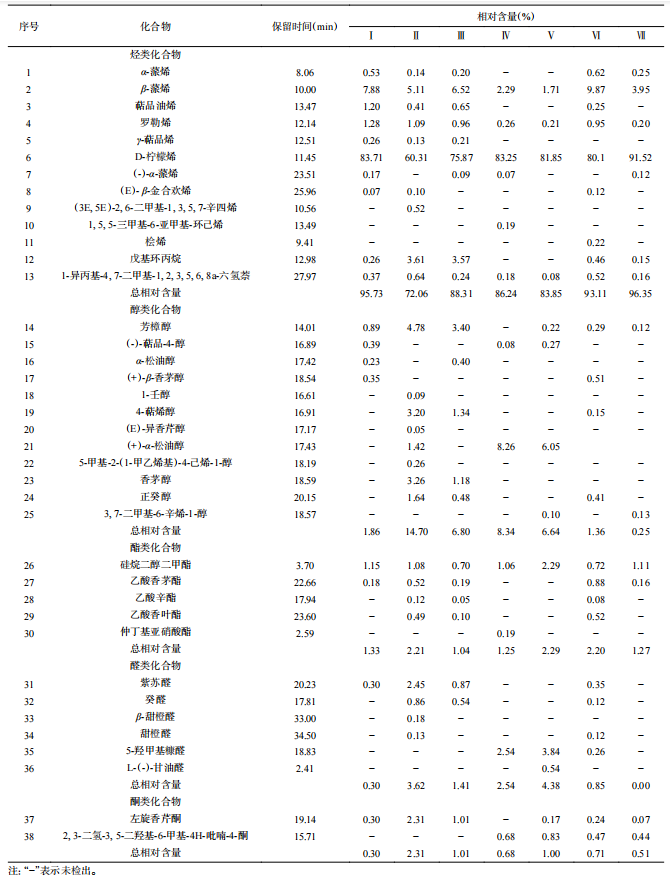 電子鼻驗證了不同成熟度沃柑可以準確區分,GC-MS進一步研究了不同成熟度沃柑揮發性香氣成分的區別及變化,結果見表5,可以看出不同采收成熟度的沃柑汁主要香氣物質共分離出38種,其中烴類13種、醇類12種、酯類5種、醛類6種、酮類2種。不同采收成熟度沃柑汁的香氣成分相對含量最高為烴類。