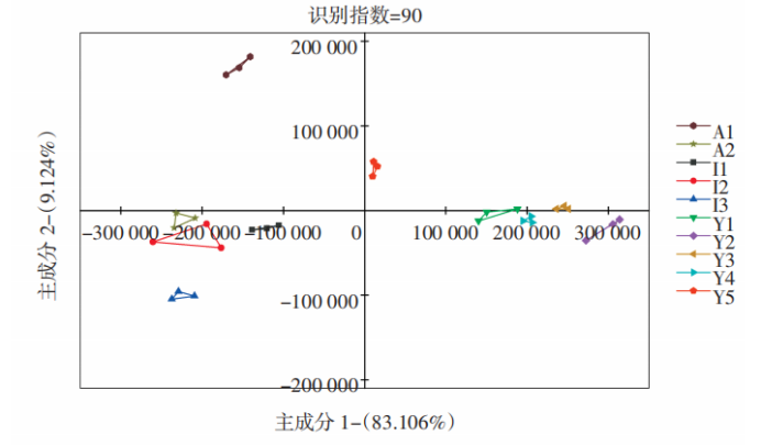 DFA結果分析對10種辣木籽電子鼻數據進行DFA結果分析,見圖5。由圖5可知,I1、I2和I3分布在DF1正半軸,A1與A2分布在第二象限內,Y1、Y2、Y3、Y4和Y5則分布在第三象限內,說明同一品種辣木籽的氣味相近,不同品種之間氣味上有較大差異。3個品種辣木籽響應值分布在不同區域內且無重疊,因此可用于判別不同品種辣木籽,與色譜圖分析一致。