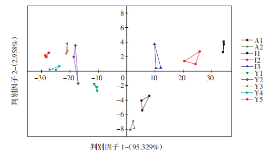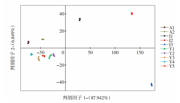 對10種辣木籽電子鼻數據進行DFA結果分析,見圖5。由圖5可知,I1、I2和I3分布在DF1正半軸,A1與A2分布在第二象限內,Y1、Y2、Y3、Y4和Y5則分布在第三象限內,說明同一品種辣木籽的氣味相近,不同品種之間氣味上有較大差異。3個品種辣木籽響應值分布在不同區域內且無重疊,因此可用于判別不同品種辣木籽,與色譜圖分析一致。