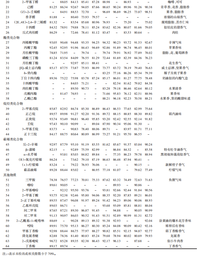 氣味成分分析10種辣木籽的氣味成分、相關指數及感官描述見表2。由表2可知,10種辣木籽共檢出64種氣味物質成分,其中醇類化合物8種,酮類化合物9種,醛類化合物9種,酯類化合物12種,烷烴類化合物6種,萜烯類化合物6種,其他類化合物14種。