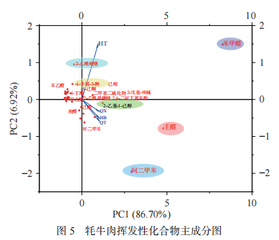 揮發性化合物數據歸一化處理后,進行主成分分析。圖5顯示PC1貢獻率86.70%,PC2貢獻率6.92%,表明主成分經降維后數據能反映原數據整體信息;其中,苯甲醛、壬醛、2-乙酰吡咯、2-乙基-1-己醇、間二甲苯相對含量突出,構成牦牛肉的主要化合物;樣品HT中苯甲醛(帶有堅果香氣)、2-乙酰吡咯(烤堅果的風味)相對含量較高,可以確定牦牛肉后腿帶有堅果風味,燒烤后風味獨特;而樣品QX、HB、QT風味化合物主要構成是壬醛、間二甲苯、2-乙基-1-己醇,位置相對較近,判斷風味相似。