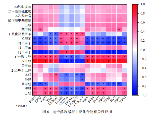 研究表明,取每個類別、相對含量前五揮發性化合物做相關性熱圖,可以辨別兩個數據之間的關聯性和差異性。電子鼻傳感器數據是宏觀化合物解析、SPME-GC-MS是具體化合物相對含量,因此有一定的相關性。采用Pearson相關性分析,將電子鼻傳感器數據與SPME-GC-MS相對含量較高的主要數據,歸一化處理后,進性相關性分析。r代表反映X軸、Y軸的線性相關程度,|r|越大相關性越強,|r|越小相關性越弱(r值在-1~1之間),P≤0.5表示顯著,其結果如圖6所示。