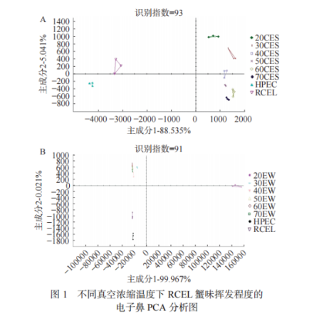 不同真空濃縮溫度下RCEL蟹味揮發(fā)程度的電子鼻主成分分析