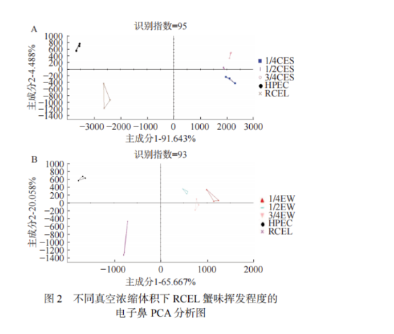 當真空濃縮體積分別濃縮至原體積的3/4、1/2、1/4時,停止旋轉(zhuǎn)蒸發(fā)過程,得到CES,同時收集EW,分別記為3/4CES、1/2CES、1/4CES;3/4EW、1/2EW、1/4EW。最后將3/4CES、1/2CES、1/4CES;3/4EW、1/2EW、1/4EW以及RCEL進行電子鼻PCA分析。