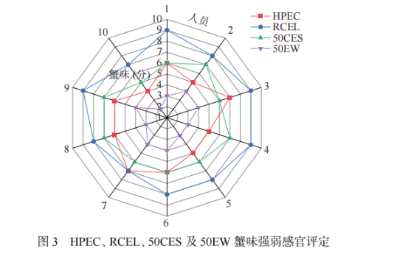 香氣感官評定 隨機選擇10名經(jīng)過感官評定培訓的人員,對制備的HPEC、RCEL、50CES和50EW蟹味強弱進行評定,蟹味濃,取7~10分;蟹味稍濃,取4~7分;蟹味較淡,取0~4分。