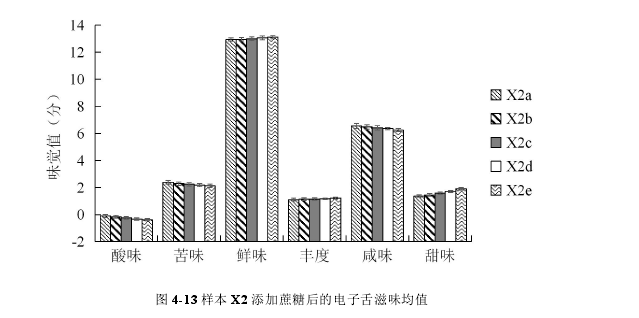 完成鮮味的調配后,由圖4-11可知樣本X2在甜味上仍與W有一定差距,因此X在添加了MSG的基礎上需要進一步提升甜味。在X2中分別添加0.1, 0.2, 0.3, 0.4,0.5 g/100ml的蔗糖,依次命名為X2a, X2b, X2c, X2d, X2e,測試得滋味響應如圖4-13所示。由圖可見,隨著糖濃度的升高,樣品的酸味、苦味和咸味有不同程度的下降,而甜味逐漸升高。