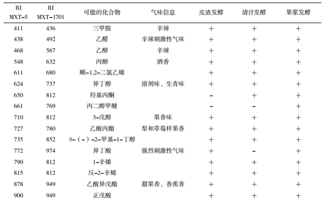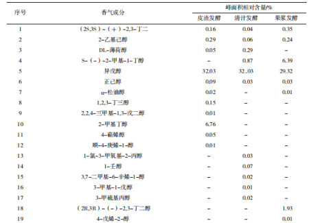 皮渣發酵柿子酒主要香氣物質為縮醛、丁二酸二乙酯、3-羥基-2-丁酮、2-甲基丁醇。清汁發酵柿子酒主要香氣成分為乙酸異戊酯、2-糠酸乙酯、乳酸乙酯、S-(-)-2-甲基-1-丁醇。果漿發酵柿子酒主要香氣物質為縮醛、丁二酸二乙酯、3-羥基-2-丁酮、S-(-)-2-甲基-1-丁醇。