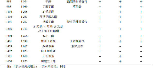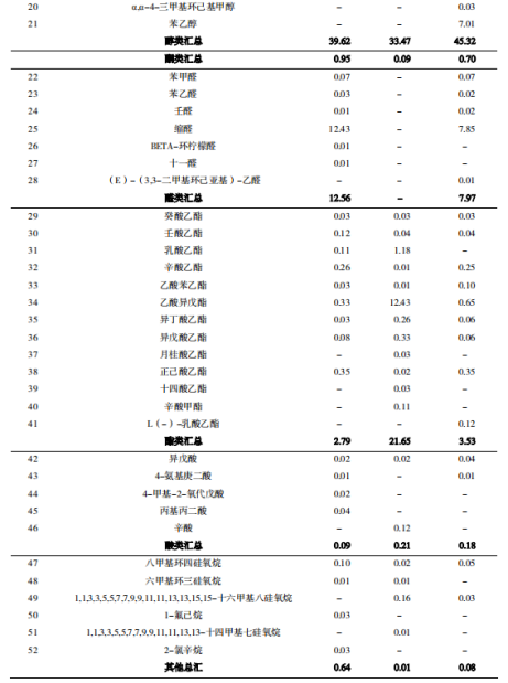 由表3可知,異戊醇(蘋果白蘭地香氣、辛辣味)、正己醇(草本植物、青草味)、丁二酸二乙酯(愉快氣味)、乙酸異丁酯(柔和水果酯香味)等是柿子酒香氣成分中相對峰面積最高的物質,為柿子酒香氣成分中的主要成分。