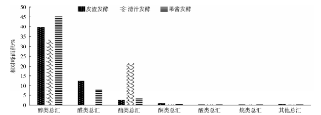 一類香氣在皮渣發酵酒和果漿發酵酒中的含量分別為16.37%和11.99%,且種類相近,而清汁發酵酒香氣物質含量為22.49%。因此,一類主成分在皮渣發酵酒和果漿發酵酒中基本相同,和清汁發酵酒對比明顯。二類香氣在皮渣發酵酒和果漿發酵酒中的含量分別為8.06%和6.59%,在清汁發酵酒中的含量僅為0.97%,對比結果與一類主成分類似。