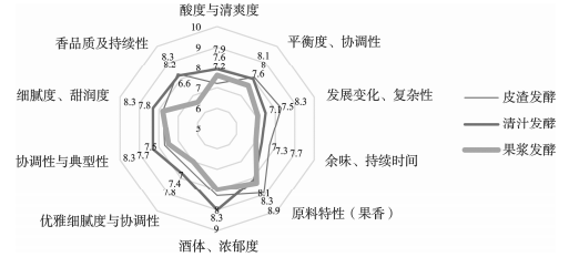 主成分分析可知,主成分為兩類香氣,一類香氣在皮渣發酵酒和果漿發酵酒中基本一致,主要為縮醛、丁二酸二乙酯、3-羥基-2-丁酮,相比于果漿發酵,皮渣發酵酒的縮醛成分更高;清汁發酵酒的主要香氣成分為乙酸異戊酯、2-糠酸乙酯、乳酸乙酯。二類香氣在皮渣發酵酒中種類最多、含量最高,主要為2-甲基丁醇,清汁發酵和果漿發酵酒的香氣成分種類相同,主要成分為S-(-)-2-甲基-1-丁醇,但其在果漿發酵酒中含量遠高于清汁發酵。