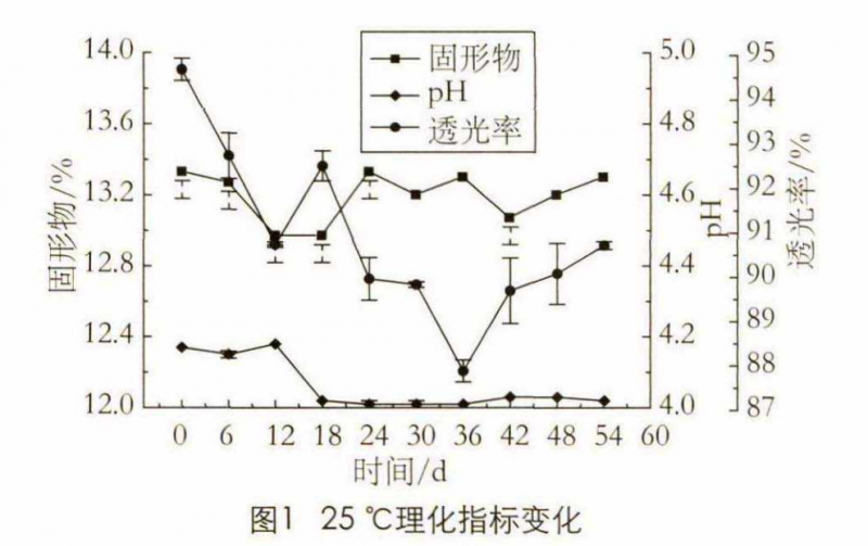 由圖1可知:25 °C下隨著儲藏時間的延長,可溶性固形物含量維持在12.87%? 13.23%,整體趨勢變化幅度不大。pH在第 18天降低為3.56,過低的pH會影響格瓦斯的風味與口感。隨著儲藏時間不斷延長,透光率從初始94.68%出現明顯下降,第 18天為9 2 . 5 2 % ,第24天降低為90.07%。根據實驗可知,當透光率降到% %以下時,飲料色澤會變差、出現細小渾濁,因此設定透光率低于90 % 的儲藏時間為貨架期終點。目卩25 °C時青稞格瓦斯貨架期為24 d。