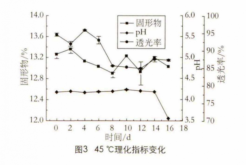 可溶性固形物、pH、透光率作為反映隨著儲藏時間的延長青棵格瓦斯品質變化的主要理化指標 ,在不同溫度下儲藏不同的時間,3個指標均會出現不同程度的變化。實驗主要從理化角度分析儲藏于25、35、45 °C下青棵格瓦斯的貨架期終點。2 5、35、45 °C下青稞格瓦斯不同儲藏時間理化指標變化見圖1?圖3。