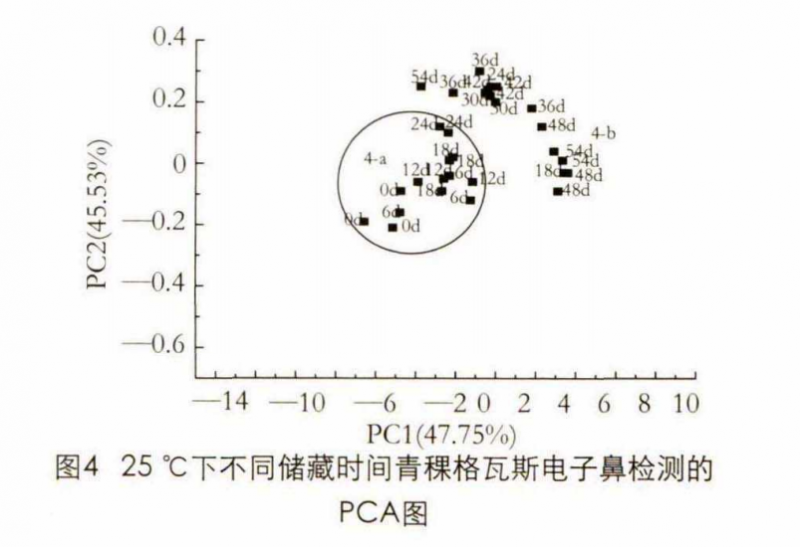 由圖4 可知:在 25 °C時 ,第一、二主成分的貢獻度分別為 47.75 % 、45.53 % , 總貢獻率達93.28%。一般坐標軸上貢獻率之和大于85 % , 便可以較好地反映整體的信息,即兩主成分包含了樣品的大部分信息。隨著儲藏時間的延長,樣品沿PC1軸向右,PC2軸先向下后向上,再向下分布。樣品儲藏在前24 d內,由于風味未發生較大變化,所以在PCA圖上各點分布較為集中;當樣品儲藏時間超過24 d,由于揮發性風味發生較大變化,各點分布與儲藏24 d前形成的區域距離較遠 。所 以 ,從風味的角度可以反映出儲藏于 25 °C下,青稞格瓦斯在24 d左右風味便發生較大變化,貨架期為24 d, 最優為18 d。