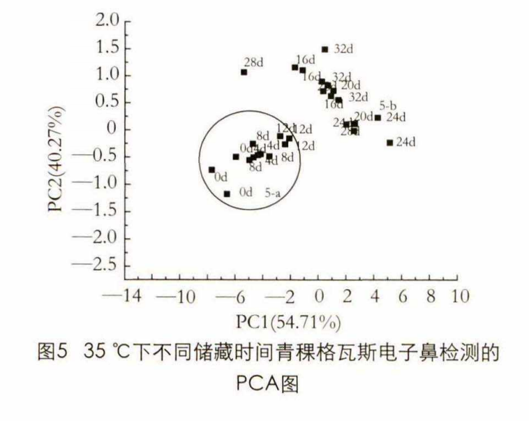 由圖5可知:在35 °C時 ,第一、二主成分的貢獻度分別為 40.27 % 、54.71 % , 總貢獻率達94.98 % ,兩主成分基本上包含了樣品的大部分信息,隨著儲藏時間的延長,樣品沿PC1軸向右,PC2軸先向下后向上分布。樣品在12 d前各點分布集中,風味變化不大,形成區域5-a; 12 d后各點在PCA圖譜上的分布與區域5-a距離較遠,風味發生顯著變化。從風味變化的程度基本可推斷在該溫度下的貨架期為12 d。
