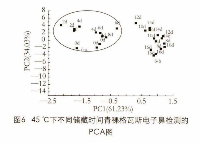 由圖6可知:在45 °C時 ,第一、二主成分的貢獻度分別為 61.32 % 、34.03 % , 總貢獻率達95.35 % ,說明主成分可以將原始髙維矩陣數據的信息較好地反映出來。樣品在6 d前各點分布集中,風味無明顯變化;6 d后各點在PCA圖譜上的分布與區域6-a距離較遠,風味發生顯著變化。從風味變化的角度分析,青稞格瓦斯儲藏在45 °C下貨架期為6 d。