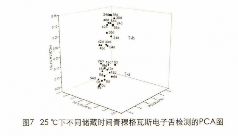 由圖7可知:隨著儲藏時間的延長,青稞格瓦斯電子舌響應信號發生變化。在溫度為25 °C時 ,第一、二、三主成分的貢獻度分別為 36.36 %、28.47 %、 14.97 % ,總貢獻率達79.8%, 3個主成分基本上包含了樣品的大部分信息。隨著儲藏時間的延長,樣品在PCA三維圖譜上延PC1與PC2構成的底面由內至外分布,延PC3軸由下至上分布。當儲藏時間在18 d之前,各樣品在PCA圖譜上分布集中,形成三維區域7-a。18 d后各點與三維區域7-a距離較遠且較為分散。所以,從滋味的角度可以反映出儲藏于25 °C下 ,青稞格瓦斯在18 d左右便發生較大變化,貨架期為18 d。