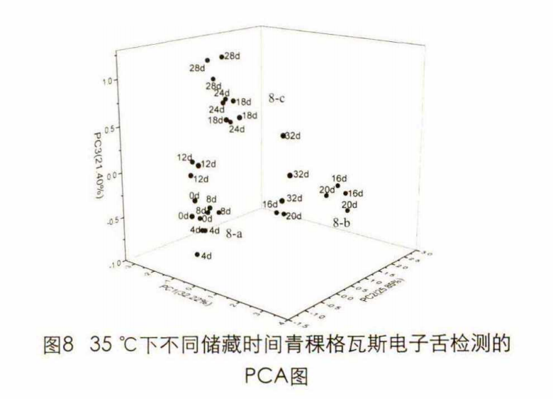 由圖8可知:當儲藏溫度為35 °C時 ,第一、二、三主成分的貢獻度分別為32.22%、25.85%、21.40%,總貢獻率達79.47%,基本上解釋了樣品的大部分信息。在三維圖譜上可以看出,隨著儲藏時間的延長,樣品延PC1、PC2構成的底面從左至右開始分布,延PC3軸先向下后向上開始分布。在儲藏時間32 d內,隨著滋味的變化樣品在PCA三維圖譜上形成了3個分布界限較為明顯的區域 ,8-a、8-b、8-c , 儲藏時間分界線分別是 12 d、16?20 d、 18 ? 24 d。