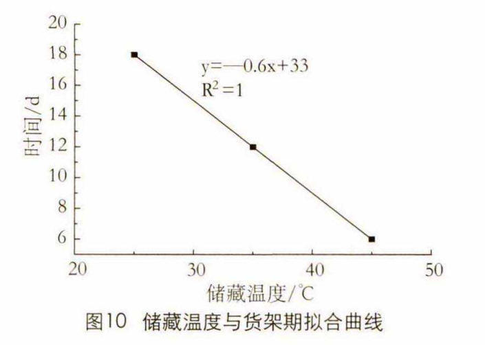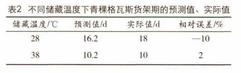 Q10值為溫度相差10 °C時食品的貨架期之比,該值用來確定溫度對反應的敏感程度,大多數據為2。由表1可知,3種溫度下青棵格瓦斯的貨架期數據,計算得Q10為 1.5?2.0,平均值為 1.75。應用Origin軟件對貨架期Y和溫度X的關系進行曲線擬合,發現Y與X的關系最符合一次函數,擬合方程為Y=-0.6X+33, R2=1。為驗證模型的準確性 ,實驗選取28、38 °C儲藏,所得格瓦斯的貨架期分別為 18、10 d, 模型預測值為16.2、10.2 d,預測值的相對誤差率在-1 0 %?2 % , 誤差較小,說明此模型可快速地對青棵格瓦斯貨架期進項初步預測。