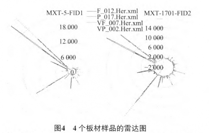 可將氣相色譜信息處理成雷達圖的形式(圖4),更為形象地展現樣品區別。出現較大的成分區別的原因:1)生產板材所使用的原料不同;2)板材生產過程中的工藝、施膠量、施膠種類、時間及是否貼面等的區別。這為分辨不同板材提供了有力的證明。