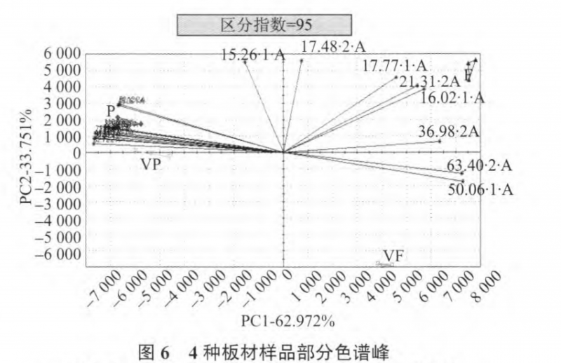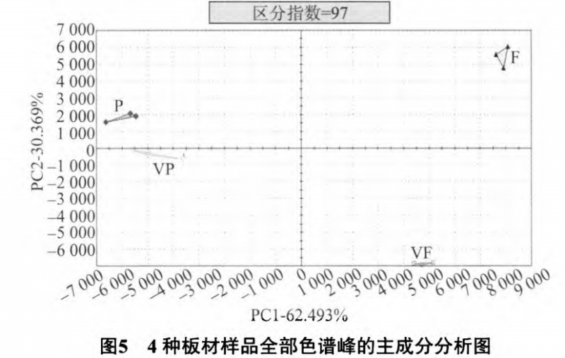 為減少試驗過程中的誤差,選取試驗中的3組數據進行分析。根據試驗方法,選擇試驗結果中的全部色譜峰進行PCA分析,得到圖5。當區分指數(Discrimination index)>80時就可以認為二者區分度較好,且數值越接近100區分度越高。由圖5可知,主成分1(PC 1)即橫坐標對4種板材的區分度為62.493%,主成分2(PC 2)縱坐標的區分度為30.369%。電子鼻將所有的區別因素化繁為簡,綜合提取了兩種區分因素即PPC l和PC 2便可將4種板材樣品區別開來。4種板材的區分指數為97,這說明Heracles II能夠很好地區分不同的人造板材樣品。
