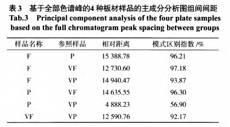 通過4種樣品的相對位置大致了解樣品的區別,橫縱坐標的數值只是相對位置。在4種板材樣品中,刨花板與貼面刨花板距離較近且明顯遠離其他兩種樣品,說明刨花板與貼面刨花板之問樣品差異較小,氣味較為接近,即刨花板貼面與否與氣味差別的大小關系相對較低。而對于纖維板和貼面纖維板樣品來說,二者相對距離較遠,不僅在種類上明顯區別于刨花板和貼面刨花板,而且可以看出是否貼面對于纖維板板材成品氣味的影響較大。