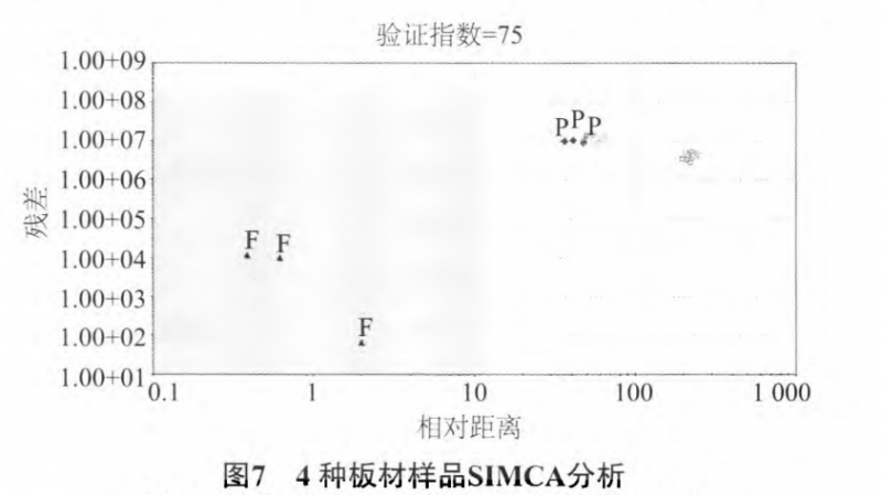 圖8為以纖維板F為控制樣,建立板材樣品的SQC 分析圖。由圖中可知,纖維板F分布在控制區域內,其他3種板材樣品則分布在控制區域外。與SIMCA分析的效果一樣,都可以對產品質檢品控和板材種類辨別分析提供參考和幫助。