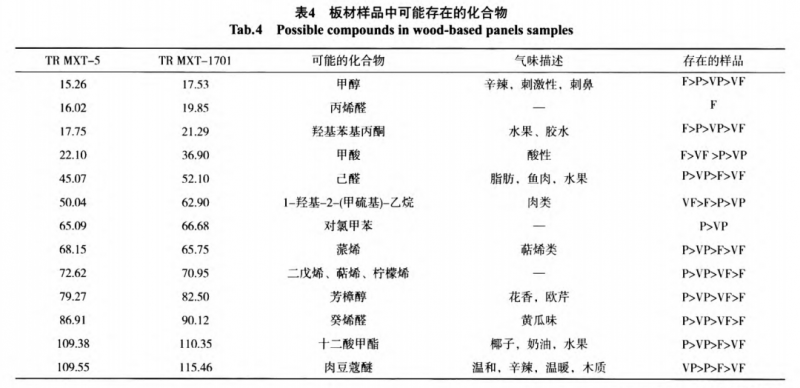 采用AroChembase數據庫對板材樣品中的揮發性化合物進行定性,可能含有的化合物見表4。