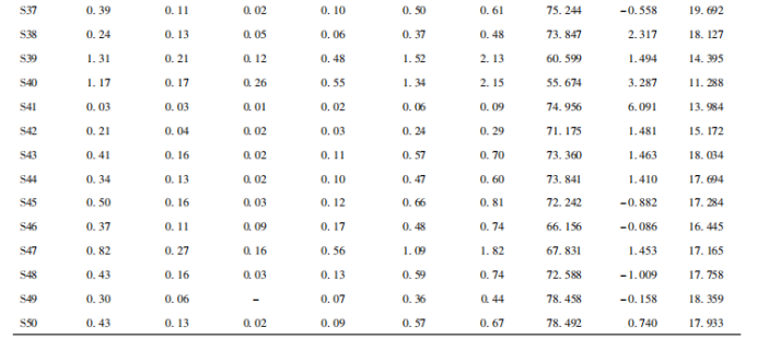 取穿心蓮藥材共50批,使用高效液相色譜儀測定,計算穿心蓮中各指標成分的含量,見表3。結(jié)果發(fā)現(xiàn)收集部位為莖的4個成分總和的質(zhì)量分數(shù)處于0.09%~0.81%;收集部位為地上部分的4個成分總和的質(zhì)量分數(shù)處于0.74%~3.48%;收集部位為葉的4個成分總和的質(zhì)量分數(shù)處于1.66%~3.69%。