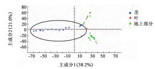 將所得數(shù)據(jù)用AlphaSoft軟件進行PCA,見圖2。結(jié)果發(fā)現(xiàn)主成分1(PC1)與主成分2(PC2)的累計R2=59.2%,說明模型的PC1與PC2體現(xiàn)了樣品絕大部分的變量信息,所收集的50批穿心蓮樣品較為清楚地分為2部分,穿心蓮的莖大多數(shù)在縱軸的左邊,除了樣品莖S7,S29,S41,S49,S50分布在縱軸右側(cè),但是這幾個樣品離縱軸左側(cè)最近。而縱軸右側(cè)主要為葉和地上部分,其中樣品葉S9~S13均分布在縱軸右側(cè)上方。