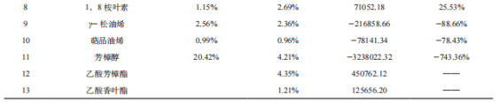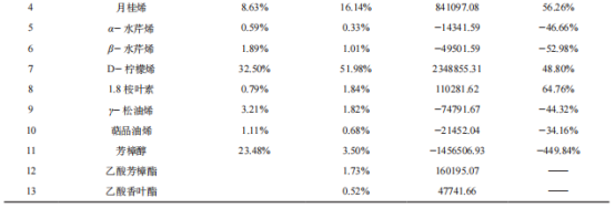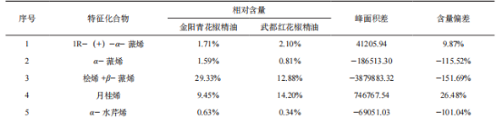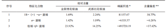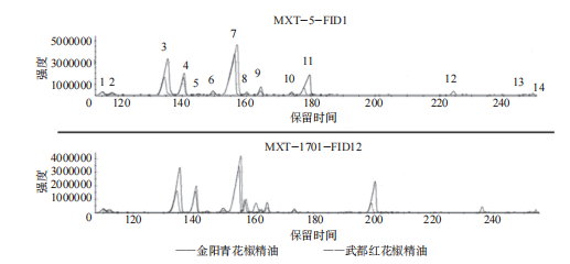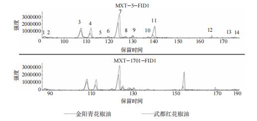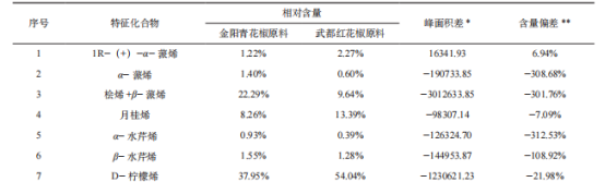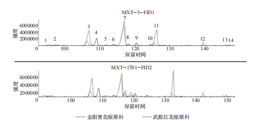 花椒作物在我國(guó)很多地區(qū)都有種植,花椒的揮發(fā)油是花椒香氣的主要來(lái)源,也是反映花椒香氣的主要指標(biāo),花椒中揮發(fā)油的含量及組成成分不僅受到花椒品種、產(chǎn)地環(huán)境因子(如產(chǎn)地氣候、雨量、日照時(shí)間、土質(zhì)等)的影響,還受到提取加工方法、提取部位和采收時(shí)期等外在因素的影響。 超快速氣相電子鼻技術(shù)具有分析速度快、靈敏度高和檢測(cè)費(fèi)用低等優(yōu)點(diǎn)。超快速氣相電子鼻將雙快速氣相色譜檢測(cè)與基于多變量統(tǒng)計(jì)的強(qiáng)大數(shù)據(jù)處理和感官及化學(xué)表征(Arochembase)的可選模塊相結(jié)合,利用超快速氣相電子鼻技術(shù),解析不同品種花椒及花椒提取物揮發(fā)性化合物,通過(guò)主成分分析建立產(chǎn)品有效判別模型,同時(shí)解析花椒物質(zhì)構(gòu)成。 不同產(chǎn)地花椒原料、花椒精油產(chǎn)品、花椒油產(chǎn)品、nC6-nC16標(biāo)準(zhǔn)溶液。 超快速氣相電子鼻;零空氣發(fā)生器;氫氣發(fā)生器;20mL頂空進(jìn)樣瓶,電子天平。 花椒:取0.2g花椒顆粒于20mL頂空進(jìn)樣瓶中,迅速加蓋密封檢測(cè),設(shè)置3個(gè)平行樣品,降低檢測(cè)誤差。 花椒精油:將花椒精油搖晃均勻后,取20uL于20mL頂空進(jìn)樣瓶中,加蓋密封檢測(cè),每個(gè)樣品設(shè)置3個(gè)平行樣。 花椒油:將花椒油搖晃均勻后,使用電子天平稱取0.1g于20mL頂空進(jìn)樣瓶中,加蓋密封檢測(cè),設(shè)置3個(gè)平行樣品。 花椒原料:樣品量0.2g,進(jìn)樣體積500uL,孵化溫度80℃,孵化時(shí)間20min,50℃恒溫30s,1℃/s速率升溫至80℃恒溫30s,3℃/s速率升溫至125℃恒溫10s,3℃/s速率升溫至250℃恒溫11s。 花椒精油:取樣量100μL,捕集溫度40℃,孵化溫度60℃,孵化時(shí)間10min,載氣流量30mL/min;進(jìn)樣量1000uL,進(jìn)樣口溫度200℃,閥溫度為250℃;FID溫度260℃,升溫程序:初始溫度45℃,保持35s,1.0℃/s升至70℃,保持30s,0.5℃/s升至140℃,3.0℃/s升至250℃,保持21s,采集時(shí)間共計(jì)288s。花椒油:取樣量0.1g,捕集溫度40℃,孵化溫度60℃,孵化時(shí)間20min,載氣流量30mL/min;進(jìn)樣量500uL,進(jìn)樣口溫度200℃,閥溫度為260℃,F(xiàn)ID溫度為260℃,升溫程序:初始溫度50℃,保持30s,1.0℃/s升至85℃,保持30s,1.0℃/s升至125℃,保持10s,3.0℃/s升至250℃,保持10s,采集時(shí)間共計(jì)197s。 將裝有樣品的頂空小瓶按照順序依次放入樣品盤(pán),每3個(gè)平行樣品后面放入一個(gè)空瓶,目的是為了消除樣品帶來(lái)的信號(hào)干擾,選擇程序進(jìn)行樣品分析。 使用Heracles超快速氣相電子鼻自帶軟件Alphasoft進(jìn)行樣品數(shù)據(jù)處理,明確揮發(fā)性風(fēng)味物質(zhì)種類與含量。 利用正構(gòu)烷烴標(biāo)準(zhǔn)溶液(nC6-nC16)進(jìn)行校準(zhǔn),進(jìn)行保留時(shí)間與保留參數(shù)之間的轉(zhuǎn)換,利用超快速氣相電子鼻自帶數(shù)據(jù)庫(kù)AroChembase數(shù)據(jù)庫(kù)對(duì)樣品中的成分進(jìn)行定性分析,采用峰面積歸一法對(duì)目標(biāo)化合物進(jìn)行定量分析,確定各香氣成分相對(duì)含量。 采用正構(gòu)烷烴標(biāo)準(zhǔn)溶液(nC6-nC16)對(duì)檢測(cè)方法進(jìn)行校準(zhǔn),結(jié)合超快速氣相電子鼻自帶AroChembase數(shù)據(jù)庫(kù)對(duì)樣品中主要揮發(fā)性成分進(jìn)行定性分析,推測(cè)得到匹配度高的化合物。 通過(guò)對(duì)比色譜圖(圖1)發(fā)現(xiàn),樣品間的出峰時(shí)間及出峰位置基本一致,峰面積間存在差異,說(shuō)明樣品中揮發(fā)性成分的種類基本一致,含量上存在略微差異。 圖1 武都紅花椒、金陽(yáng)青花椒原料指紋圖譜 青花椒原料中共分析出11種含量較高成分,紅花椒原料中共分析出13種含量較高成分,乙酸芳樟酯與乙酸香葉酯在青花椒中未曾檢測(cè)出。通過(guò)計(jì)算,可知青、紅花椒不僅成分種類上有差異,各成分含量上同樣差異明顯。除1R-(+)-α-蒎烯、1,8桉葉素、乙酸芳樟酯、乙酸香葉酯外,其他成分均是青花椒中含量較紅花椒高。其中,青紅花椒原料中芳樟醇含量差別最大,差異最為明顯,D-檸檬烯含量差別較大,但相對(duì)偏差不大,推斷不是造成青紅花椒風(fēng)味不同的主要差異。乙酸芳樟酯、乙酸香葉酯僅存在于紅花椒原料中,由此可利用花椒原料產(chǎn)品中芳樟醇、乙酸芳樟酯、乙酸香葉酯含量區(qū)分花椒原料種類。 表1 武都紅花椒、金陽(yáng)青花椒原料特征化合物相對(duì)含量與峰面積差異 青花椒精油中共分析出11種含量較高成分,紅花椒精油中共分析出13種含量較高成分,乙酸芳樟酯與乙酸香葉酯在青花椒中未曾檢測(cè)出,與原料表現(xiàn)一致。通過(guò)計(jì)算峰面積差值和含量偏差可知,乙酸芳樟酯等酯類物質(zhì)僅存在于紅花椒中。1R-(+)-α-蒎烯、月桂烯、D-檸檬烯、1,8桉葉素在紅花椒精油中含量較高,其他組分在青花椒精油中含量較高,和原料情況不一致,可能和提取工藝有關(guān)。其中芳樟醇含量差別最大,差異最為明顯,乙酸芳樟酯、乙酸香葉酯僅存在于紅花椒精油產(chǎn)品中,由此可利用花椒精油產(chǎn)品中檜烯、β-蒎烯、芳樟醇含量和乙酸芳樟酯、乙酸香葉酯等酯類物質(zhì)存在與否來(lái)區(qū)分花椒精油種類。 圖2 武都紅花椒精油、金陽(yáng)青花椒精油指紋圖譜 表2 武都紅花椒精油、金陽(yáng)青花椒精油特征化合物相對(duì)