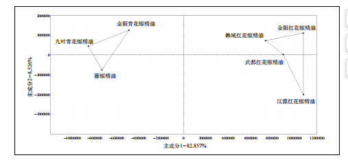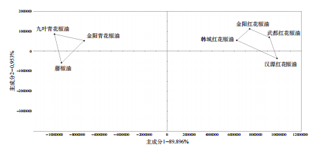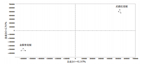 青花椒油中共分析出11種含量較高成分,紅花椒油中共分析出13種含量較高成分,乙酸芳樟酯與乙酸香葉酯在青花椒油中未曾檢測(cè)出。 通過(guò)計(jì)算峰面積差值和含量偏差可知,乙酸芳樟酯等酯類物質(zhì)僅存在于紅花椒油中,與精油情況一致,青紅花椒油中芳樟醇含量差別最大,差異最為明顯,乙酸芳樟酯僅存在于紅花椒原料中,由此可利用花椒精油產(chǎn)品中檜烯、β-蒎烯、芳樟醇含量和乙酸芳樟酯、乙酸香葉酯等酯類物質(zhì)存在與否來(lái)區(qū)分花椒精油種類。對(duì)青紅花椒原料及花椒提取物進(jìn)行指紋圖譜與物質(zhì)定性分析,青紅花椒在成分種類上有差異,紅花椒成分較青花椒復(fù)雜,主要體現(xiàn)在乙酸芳樟酯、乙酸香葉酯等酯類和醛類物質(zhì)上;青紅花椒各成分相對(duì)含量上差異明顯,其中芳樟醇、檜烯差異最為明顯,D-檸檬烯含量差別大,但差異貢獻(xiàn)度不大;芳樟醇、乙酸芳樟酯等成分可用來(lái)鑒別青紅花椒產(chǎn)品類別,且電子鼻分析速度快,可大大節(jié)約成本。 圖3 武都紅花椒油、金陽(yáng)青花椒油指紋圖譜 表3 武都紅花椒油、金陽(yáng)青花椒油特征化合物相對(duì)含量與峰面積差異 主成分分析(PCA)是一種常見(jiàn)的多元統(tǒng)計(jì)方法,主要通過(guò)將采集的多指標(biāo)進(jìn)行數(shù)據(jù)轉(zhuǎn)換與降維,使用線性分類處理降維的特征向量,盡可能捕集數(shù)據(jù)集間最大差異,從整體層面上直觀地展示樣品分布。對(duì)花椒原料、花椒精油、花椒油進(jìn)行主成分分析,由圖4原料主成分分析可以看出,兩種花椒原料之間存在顯著差異,現(xiàn)有數(shù)據(jù)可對(duì)未知產(chǎn)地的原料進(jìn)行產(chǎn)地區(qū)分,前提是原料來(lái)自兩個(gè)產(chǎn)地。后續(xù)可收集其余產(chǎn)地花椒原料,積累大量數(shù)據(jù),建立原料質(zhì)量標(biāo)準(zhǔn),對(duì)實(shí)際應(yīng)用中采購(gòu)、生產(chǎn)、銷(xiāo)售提供指導(dǎo)性建議。 圖4 武都紅花椒、金陽(yáng)青花椒原料主成分分析 對(duì)6類花椒精油樣品進(jìn)行PCA分析,結(jié)果如圖5所示,PC1與PC2相加大于91.38%,代表被檢測(cè)樣品中絕大部分信息,說(shuō)明實(shí)驗(yàn)的花椒精油樣品成分存在差異,呈現(xiàn)不同類型風(fēng)味,主成分分析能對(duì)不同種類花椒精油進(jìn)行識(shí)別與區(qū)分。 對(duì)四類花椒油樣品進(jìn)行PCA分析,結(jié)果如圖6所示,PC1方差貢獻(xiàn)率為89.896%,PC2的方差貢獻(xiàn)率為0.953%,兩者累計(jì)方差為90.849%,主成分顯示樣品中絕大部分信息,說(shuō)明實(shí)驗(yàn)的花椒油樣品成分存在差異,呈現(xiàn)不同類型風(fēng)味,主成分分析能對(duì)不同種類花椒油進(jìn)行識(shí)別與區(qū)分。 利用超快速氣相電子鼻技術(shù),解析不同產(chǎn)地花椒及花椒提取物指紋圖譜,明確花椒及花椒提取物揮發(fā)性風(fēng)味物質(zhì),芳樟醇、乙酸芳樟酯等成分可用來(lái)鑒別青紅花椒產(chǎn)品類別,且電子鼻分析速度快,可大大節(jié)約成本,利用超快速氣相電子鼻技術(shù)可識(shí)別花椒中的關(guān)鍵香氣成分,為花椒品種篩選、產(chǎn)地識(shí)別和深加工提供理論依據(jù)。