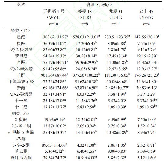 通過HS-SPME-GC-MS和快速氣相電子鼻對我國東北地區4種代表性粳米的揮發性成分及香氣組分進行分析鑒定,除去對香氣貢獻較小的烷烴和雜質,GC-MS共鑒定出24種香氣成分,包括醛類12種、酮類6種、雜環類3種、烯烴類2種、酯類1種(表1);快速氣相電子鼻共檢測到82個主要峰,通過相關指數篩選和比對GC-MS數據后,共鑒定出13種香氣成分(表2),包括醛類8種、醇類2種、酮類2種、硫化物1種。通過GC-MS數據對比發現,4種粳米香氣組成類似,醛類化合物為粳米中的主要香氣組分,這與電子鼻鑒定數據一致,其中己醛、壬醛為醛類主導組分,其在較低濃度時具有水果、花香、柑橘樣的香氣。另外,五優稻4號中絕大多數香氣化合物含量均顯著(p≤0.05)高于綏粳18、龍粳31和鹽豐47。因此,五優稻4號相比其它3種粳米香氣更加濃郁,五優稻4號又稱稻花香2號,由五優稻1號和黑香稻異交而來,具有宜人的香氣。