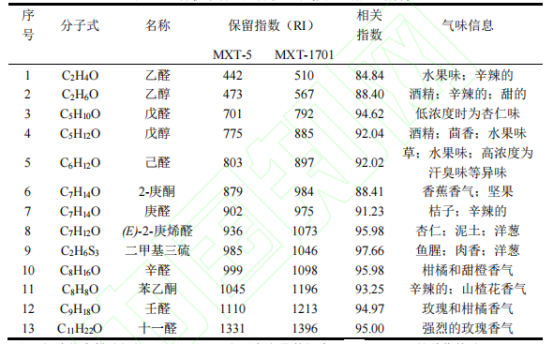 通過正構烷烴(C6~C16)進行校準,將保留時間轉化為保留指數,然后通過Kovats保留指數定性,在Arochembase數據庫中對化合物進行定性分析。