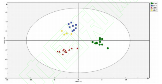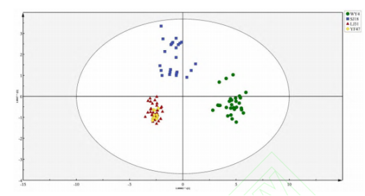 總體上看,五優稻4號和綏粳18能進行一定區分,龍粳31和鹽豐47區分效果較差,從香米非香米角度觀察,香米樣品和非香米樣品能較好區分,這與上述OPLS-DA模型結果一致。