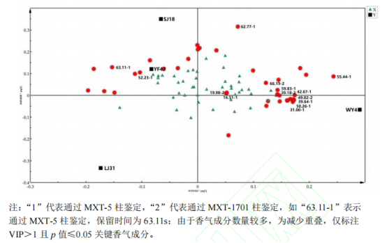 圖3 OPLS-DA模型因子載荷圖(GC-MS)